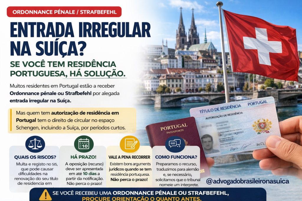 Receber uma ordonnance pénale ou um Strafbefehl na Suíça por alegada entrada irregular não deve ser ignorado, especialmente por quem possui autorização de residência em Portugal.